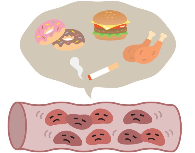 動脈硬化の危険因子としては、高血圧・血液中の脂質の異常(高脂血症)・糖尿病・加齢(男性:45歳以上、女性:閉経後)・喫煙・肥満・運動不足・ストレス・偏った食事内容・嗜好品(アルコール)―などが知られています。